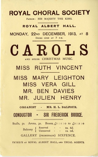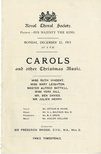 | Set List | Chorus: 'Lo! Star-Led Chiefs', Crotch, Quartet and Chorus: 'In Dulci Jubilo' (Ruth Vincent, Vera Gill, Ben Davies, Julien Henry), Song: 'A Christmas Cradle-Song', Erkki Melartin (ML) Chorus: 'Ring Out! With Jocund Chime', Sir Frederick Bridge (Bells - Avalon Collard), Contralto Solo and Chorus: 'Three Kings Once Lived', Cowen (Vera Gill), Chorus: 'The Morning Star', Sir Frederick Bridge, Song: 'A Christmas Song', Sir Frederick Bridge (Ben Davies), Chorus: 'A Babe Ye Borne I Was', Sir Frederick Bridge , Chorus: 'God Rest You Merry, Gentlemen', trad., Soprano Solo and Chorus: 'O Holy Night!', Adolphe Adam, arr John E West (Ruth Vincent) INTERVAL Chorus with Quartet: 'Welcolm Be Our Heavanly King', Sir Frederick Bridge (Mary Leighton, Vera Gill, Ben Davies, Julien Henry), Soprano Solo and chorus: 'Mary's Cradle Song', Robin H Legge (Mary Leighton), Quartet and Chorus: 'When the Crimson Sun Bad Set', trad., arr. S S Greatheed (Ruth Vincent, Vera Gill, Ben Davies, Julien Henry), Chorus: 'The 'Bowe Bells' Carol, arr. Sir Frederick Bridge (Bells - Avalon Collard), Soli and Chorus: 'Good King Wenceslas' (Julien Henry), Song: 'Ave Maria', Bach, arr. Gounod (Ruth Vincent, Arthur W Payne), Quartet and Soprano Chorus: 'Come And Hear The Angels', Charles H Lloyd (Mary Leighton, Vera Gill, Ben Davies, Julien Henry), Song: 'A Carol for New Year's Day' to the tune of Green Sleeves, trad. (Ben Davies), Solo and Chorus: 'Nazreth', Gounod (Julien Henry), Chorus: 'The First Nowell' |