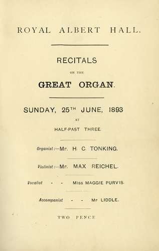 | Main Performers | Maggie Purvis, H C Tonking - organ Max Reichel - violin |