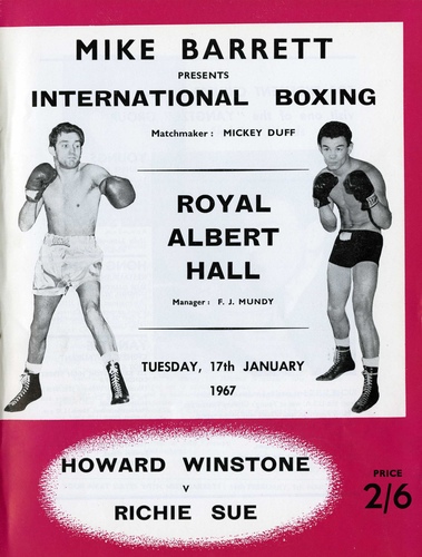 | Set List | Featherweight - Howard Winstone (Merthyr) v Richie Sue (Portland, USA), Bantamweight - Brian Packer (Dartford) v Bobby Davies (West Ham), Featherweight - Jimmy Anderson (Waltham Cross) v Lope de Pablo (Spain), Middleweight - Mark Rowe (Camberwell) v Derek Cowper (Glasgow), Heavyweight - Terry Daly (Battersea) v Len 'Rocky' James (Bristol), Bantamweight - Johnny Clark (Walworth) v Pat Hughes (Glasgow), Light-Heavyweight - Jimmy Tibbs (West Ham) v Johnny Ould (Bermondsey) |