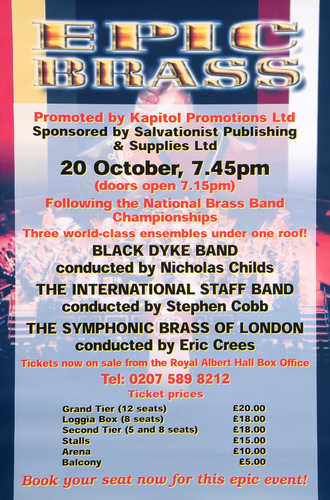 | Set List | 'Toccata in D Minor', Bach, arr. Ray Farr (Black Dyke Band), 'The Corsair', Berlioz, arr. Geoffrey Brand (Black Dyke Band), 'Brillante', Peter Graham (Black Dyke Band, David Thornton), 'Toccata' from Suite Gothique, Boellmann, arr. Eric Ball (Black Dyke Band), 'Truth Aflame', Kevin Norbury (The International Staff Band of the Salvation Army), 'I Know Thou Art Mine', Len Ballantine (The International Staff Band of the Salvation Army), 'Rejoice! The Lord is King', Kenneth Downie (The International Staff Band of the Salvation Army), INTERVAL 'Dance Episodes from On the Town', Bernstein, arr. Eric Crees (The Symphonic Brass of London), 'Suite' from West Side Story, Bernstein, arr. Eric Crees (The Symphonic Brass of London), 'Also Sprach Zarathustra', Strauss, arr. Peter Graham (Massed Bands), 'Wonderful Words', Wilfred Heaton (Massed Bands), 'Lord of All Hopefulness', Kenneth Downie (Massed Bands), 'March from Pines of Rome', Respighi, arr. Howard Snell (Massed Bands) |
