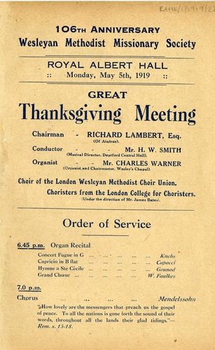 | Main Performers | Richard Lambert Esq. (Chairman), Rev. Samuel Chadwick (President of the Conference), Rev. Marshall Hartley, Rev. William Goudie, Rev. George M Kerr, Rev. William Meara - speakers, Miss Hilda Acton - vocal, Mr Charles Warner - organ |