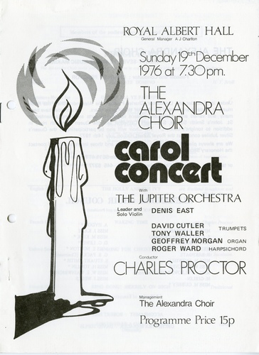 | Set List | 'Motet-Cantate Domino', H T Scull, 'O Come All Ye Faithful', 'The Holly and the Ivy', arr. Rutland Bougton, Charles Proctor, 'Waking Time', arr. Proctor, 'A Song for Christmas', King Charles I, arr. Jacobson, 'Ding Dong! Merrily on High', trad., 'The First Nowell', 'Canzona and Choral', Charles Proctor (Geoffrey Morgan, The Jupiter Orchestra), 'Sans Day', trad., 'I Have Seen Sweet Mary Going', Whitehead, 'Steeples Set Your Bells A-Ringing', 'We've Come From Far A-Caroling', Mary Manson, 'Concerto for Two Trumpets and Orchestra', Vivaldi (David Cutler, Tony Waller, The Jupiter Orchestra), 'Christmas Pudding Song', arr. Proctor, 'Good King Wenceslas' INTERVAL 'Praise Him' (The Four Seasons), Bach, arr. Michael Diack, 'It's Who You're With That Counts', Edward Hughes, 'Winter' (The Four Seasons), Vivaldi (Denis East, The Jupiter Orchestra), 'Navidad Nuestra', Ariel Ramirez, 'O Little Town of Bethlehem', 'Silent Night', Gruber, 'Ring Out Wild Bells', Percy Fletcher, 'Lord of the Dance', arr. Sydney Carter, 'Ye Watchers and Ye Holy Ones', arr. Oldroyd |