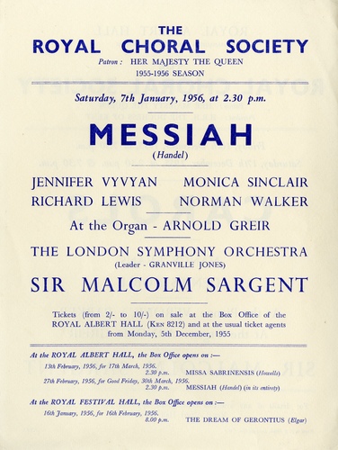 | Main Performers | Jennifer Vyvyan, Monica Sinclair, Richard Lewis, Norman Walker - vocals, George Eskdale - trumpet |