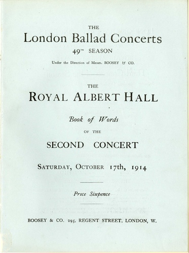 | Set List | 'An Old Garden', Hope Temple (Mabel Mann), 'Mountain Lovers', W H Squire (Ivor Walters), 'How Lovely Are Thy Dwellings', S Liddle (Carrie Tubb), 'Blow, Blow, Thou Winter Wind', J Sarjeant (Norman Williams), Violin Soli: 'Nocturne, D Major', Chopin (Melsa), 'Zephyr', Hubay (Melsa), New Song: 'Soldiering', Ivor Novello (Marion Beeley), Song: 'In the Dawn', Edward Elgar (John Coates), Air: 'Let the Bright Seraphim' from Samson, Handel (Flora Woodman, John Solomon), New Songs: 'Forlorn', Amy Woodforde-Finden (Gregory Stroud), 'The Eyes of Firozee', Amy Woodforde-Finden (Gregory Stroud), The National Anthems of The Allies - Belgium, Russia, France, Great Britain, arr. Arthur Fagge (London Choral Society), 'Rule, Britannia', Arne INTERVAL Part-Song: 'Old Londonderry Air', arr. Percy Grainger (London Choral Society), Song: 'The Valley by the Sea', Stephen Adams (Mabel Mann), New Songs: 'Megan', Ivor Novello (Ivor Walters), 'A Song of Gladness', Wilfrid Sanderson (Carrie Tubb), Song: 'England's Call', Wilfrid Sanderson (Norman Williams), Violin Soli: 'Melodie', Tchaikovsky (Melsa), 'Guitarre', Moszkowski (Melsa), Songs: 'My Ships', Augustus Barratt (Marion Beeley), 'The Silence of the Past', Charles Marshall (John Coates), 'Swiss Echo Song', C Eckert (Flora Woodman), 'A Spray of Roses', Wilfred Sanderson (Gregory Stroud), Chorus: 'Land of Hope and Glory', Edward Elgar, arr. Arthur Fagge (London Choral Society) |