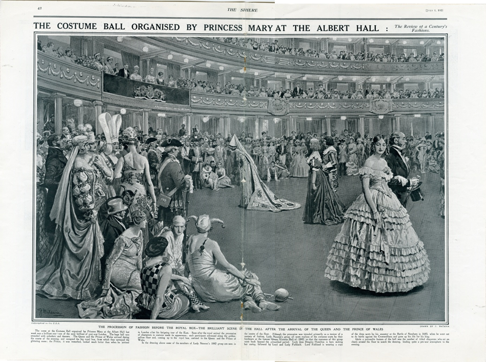 "The scene at the Costume Ball organised by Princess Mary at the Albert Hall last week was a brilliant one - one of the most brilliant of post-war London. The huge hall was crowded with onlookers and dancers. The Queen and the Prince of Wales arrived during the course of the evening, and occupied the big royal box, from which they surveyed the glittering scene, the Prince, it was remarked, looked much better than when he arrived in London after his fatiguing tour of the East. Soon after the royal arrival the procession of characters in costume made its appearance; each participant advanced along the golden yellow floor and, coming up to the royal box, curtsied to the Queen and the Prince of Wales. In the drawing above some of the members of Lady Newnes's 1842 group are seen in the centre of the floor. Although the procession was intended primarily as a review of a century of fashion, Lady Newnes's group wore replicas of the costumes worn by their forebears at the famous Queen Victoria Ball of 1842, so that the costumes of this group went back beyond the prescribed period. Lady Jean Douglas Hamilton is here making her curtsy, followed by Lord and Lady Falkland. Lord Falkland is wearing a copy of the dress worn b his ancestor at the Battle of Newbury in 1643, when he went out to do battle against the Cromwellians and gave up his life for his king. Quite a noticeable feature of the ball was the number of titled chaperons who sat on chairs around the floor to watch the dancing, lending quite a pre-war atmosphere to the evening." (The Sphere, 8 July 1922) |
