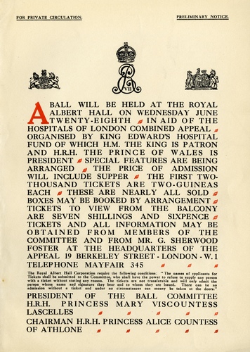 | Performance Notes | The Clabon-West Dance Orchestra, under the direction of Mr P S Clabon-Glover. The evening featured fashion parades and pageants, with supper in the gallery. The Royal Albert Hall was decorated to suggest Vauxhall Pleasure Gardens.