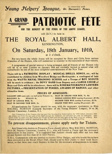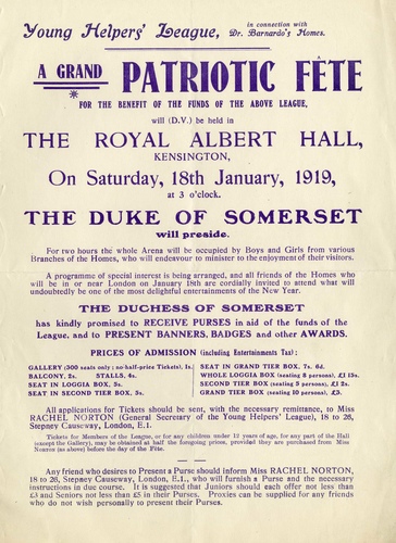 | Performance Notes | "For upwards of two hours a large audience was entertained by children from the Girls' Village Homes, the Naval Training School, and the Boys' Garden City, representing the varied interests and activities, as well as the industries and recreations, of the Homes. An interesting feature was the entry into the arena of a number of soldiers, sailors, and discharged Service men, headed by two officers who, like the others, has passed through the Homes to the Services. The Duke of Somerset spent some time chatting to Lieutenant McCallum and Sergeant-Major Hall. The former has been decorated with the Transport medal (an Italian decoration) for bringing up medical supplies; and Sergeant-Major Hall gained the Distinguished Service Medal while serving with the Royal Marines at Antwerp, when he crawled 200 yards under shell and rifle fire to obtain ammunition. "The Duchess of Somerset received a large umber of purses, and distrubuted badges and bars to members of the League... A group of Service men's children who are being cared for in the homes marched across the arena, and then there was amarch past of over 500 boys and girls, symbolizing the Empire and the Allies and the various forms of war activity." (The Times, 20 January 1919)