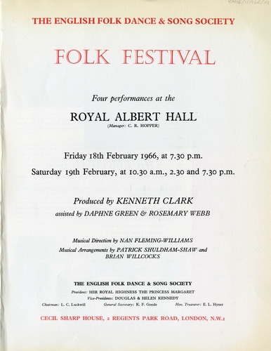 Long Sword Dance (Dancers from Handsworth, Sheffield), Yugoslav Dances (Jedinstvo Ansamnl Norodnih Igara I Dalmatinskkh Pjesama), Suburban Safari - Brian Willcocks (Denis Smith, Mervyn Clayton, Reg and Joyce Chipperfield, Ian Legge and Sheila Chaston, Peter Jackson, Joan Jackson, Michael Knell, Bert Cleaver, Tom Cronin, Brian Dawe, Colin Fleming, Rowland Howls, Alan Tetlow, McBain's Band and The Ranchers) INTERVAL Overture (Folk Clubs), Dances by The Festival Dancers - Soldier's Joy, Margaret's Waltz, Jubilee Roundabout, Rapper Sword Dance (Headington Quarry Morris Dancers), Folk Songs (Bob Roberts), Irish Dances - The Aran Crios, Solo Reel - Dorothy Maher, Hornpipe (Rory O'Connor Irish Dancers), Morris Dances - Hey Away'(Bledington), Leapfrog (Bledington), The Monk's March (Sherborne), Bonny Green Garters - with Bert Cleaver (Bampton) (Headington Quarry Morris Dancers), Yugoslav Dances (Jedinstvo Ansamnl Norodnih Igara I Dalmatinskkh Pjesama), Finale - Circassian Circle, 'God Save The Queen' (The National Anthem) |