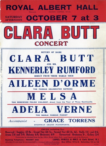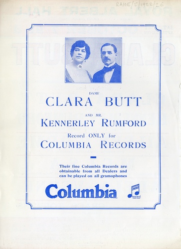 | Main Performers | Dame Clara Butt, Astra Desmond, Kennerley Rumford - vocals, Melsa - violin, Adela Verne - piano |