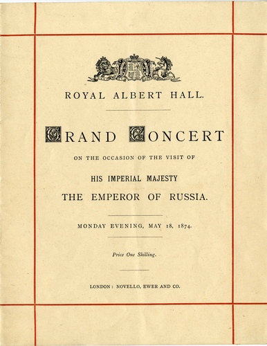 | Set List | Overture, 'Fra Diavolo', Auber, Chorus, 'The Starts that above us are shining', Weber, Scena, 'Ernani involami' (Ernami), Verdi (Titiens), Chorus (Male Voices), 'Rosamunde', Schubert, Polonaise, with Chorus, from the Opera, 'Life for the Czar', Glinka, Romance, 'O ma maitresse', David (W H Cummings), Organ Solo, March in Eb, H Smart (Stainer), Part Song, 'Sweet and Low', J Barnby, Aria, 'Se il rigor' (La Juive), Halevy (Foli), 10. March and Chorus, 'Tannhauser', Wagner, INTERVAL (The Band of the Grenadier Guards under the direction of Mr D Godfrey, will play a Selection of Music between the Parts of the Concert) The Russian National Anthem (Arrival of His Imperial Majesty), Selection of Russian Sacred Music, Arietta, 'Caro mio ben', Giordanni (Patey), Part Song, 'O Hush thee, my babie', Arthur Sullivan, Madrigal, 'Fire, fire, my heart', Morley, Air, 'Let the bright Seraphim', Handel, Chorus, 'Halleljah', Handel, Quartet, 'Over the dak blue waters' (Oberon), Weber, Chorus, 'Domine salvam fac Reginam' (Festival Te Deum), Arthur Sullivan, 'God Save the Queen' (The National Anthem) |
