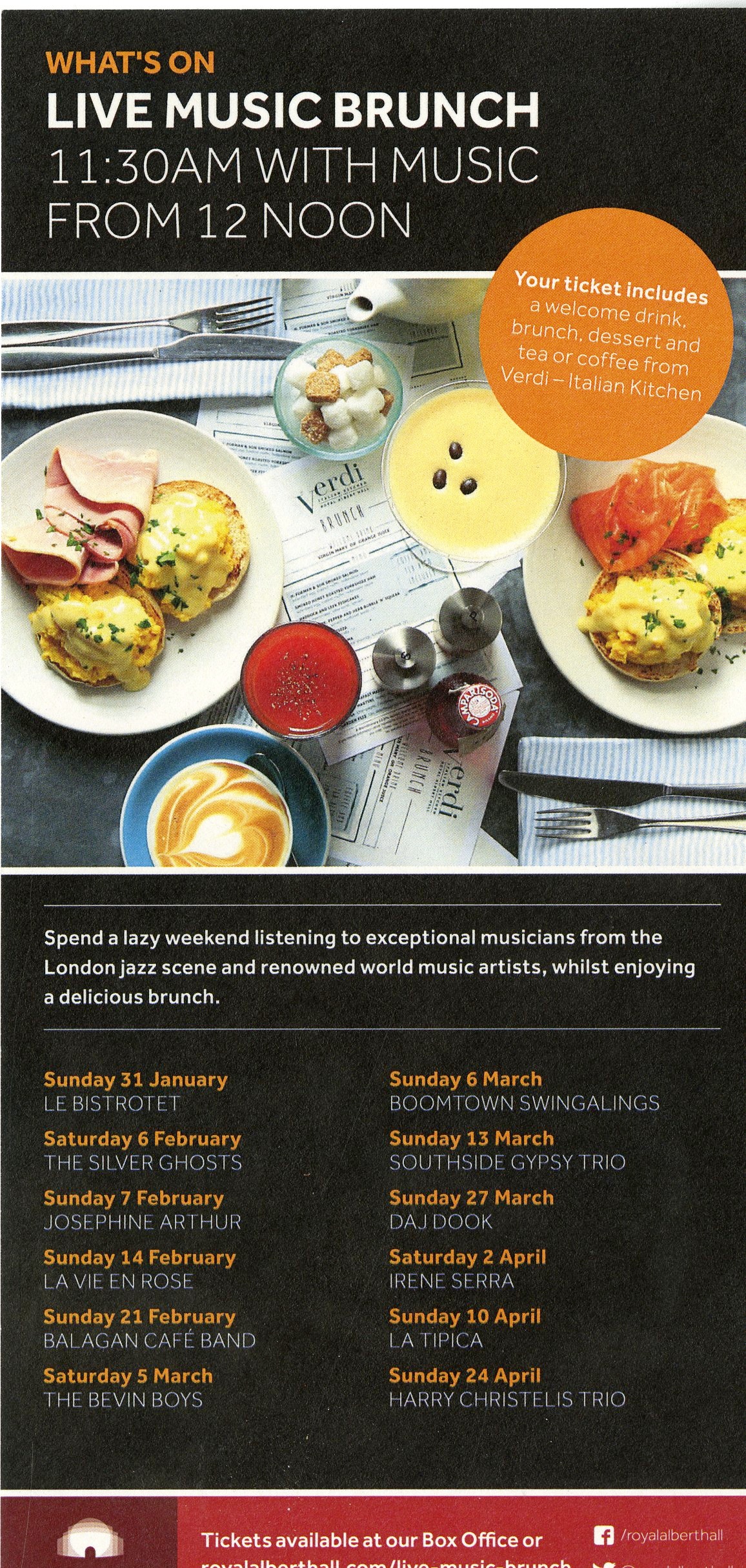 Live Music Brunch takes place in Verdi Italian Kitchen at the Royal Albert Hall, which offers casual dining and great music within one of Londons most iconic settings. Your ticket includes a welcome drink, main course and dessert, served with tea or coffee, all accompanied by great live music. |