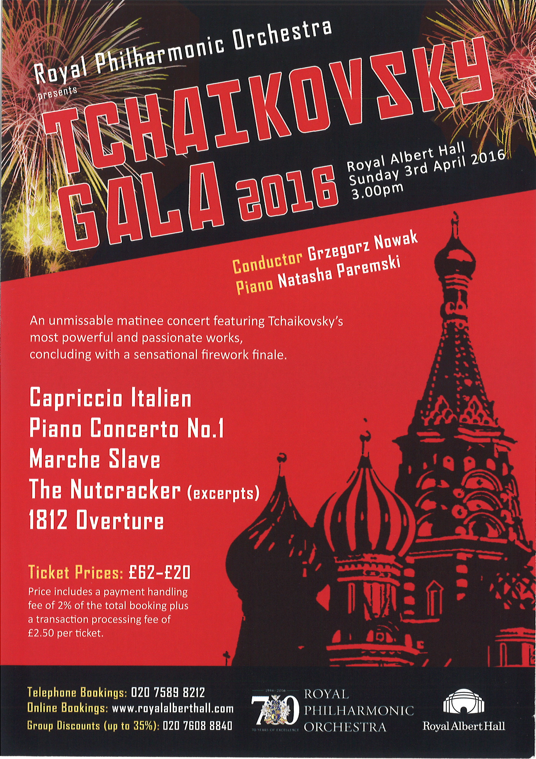 | Set List | 'Capriccio Italien', Tchaikovsky, 'Piano Concerto No.1',Tchaikovsky, 'Marche Slave',Tchaikovsky, 'March' from The Nutcracker', Tchaikovsky, 'Trepak (Danse Russe)' from The Nutcracker', Tchaikovsky, 'Arabian Dance' from The Nutcracker', Tchaikovsky, 'Chinese Dance' from The Nutcracker', Tchaikovsky, 'Waltz of the Flowers' from The Nutcracker', Tchaikovsky, '1812 Overture',Tchaikovsky ENCORE 'Dance of the Mirlirons' from The Nutcracker', Tchaikovsky |