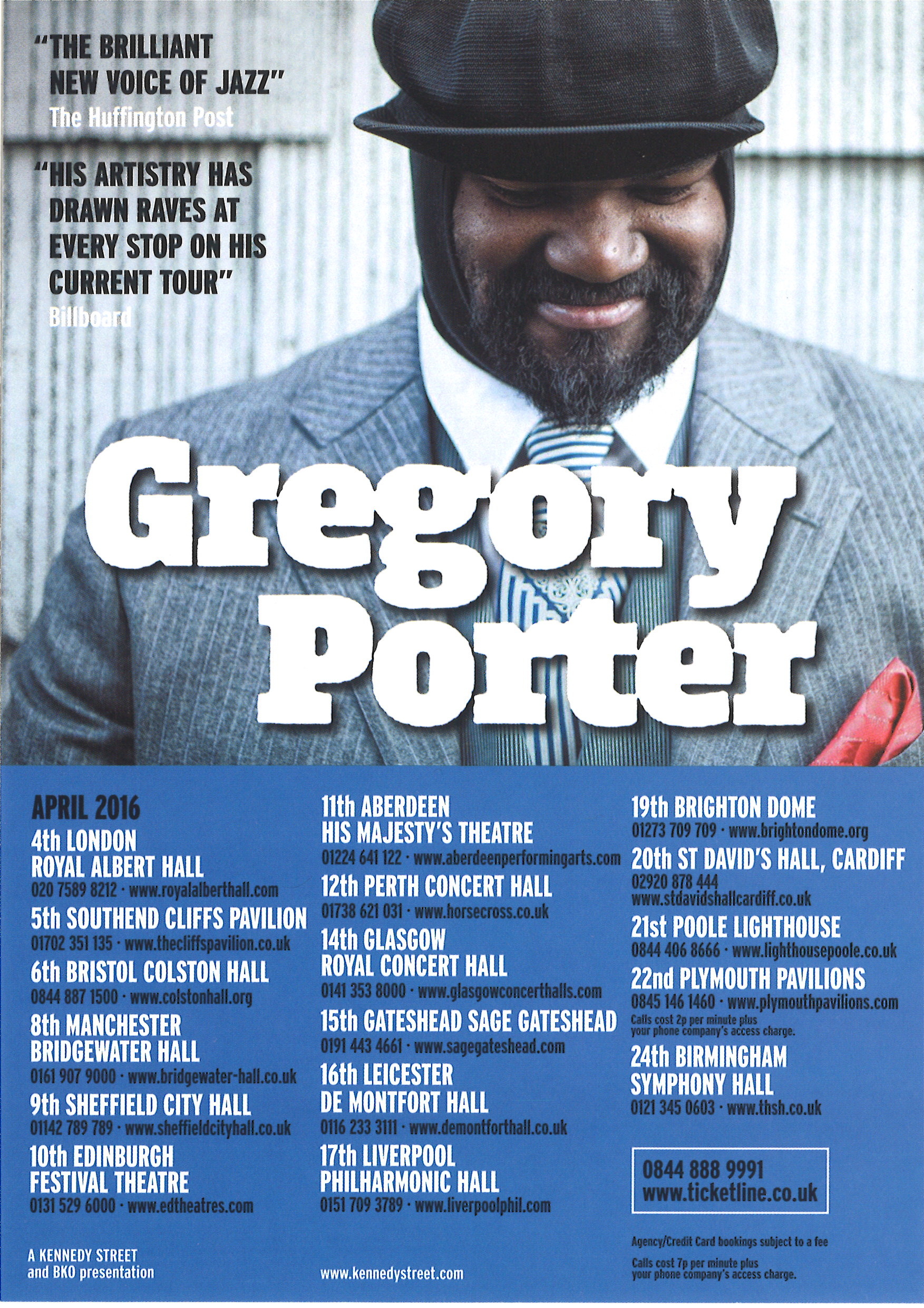 Gregory Porter: 'Holding On', Disclosure, 'On My Way to Harlem', 'Take Me To the Alley', 'Liquid Spirit', 'No Dying Love', 'Papa Was a Rollin' Stone', The Undisputed Truth, 'Muscial Genocide', Don't Be a Fool', 'Don't Lose Your Steam', 'Be Good', 'Work Song', N Adderley, 'Hey Laura', 'Free' ENCORE 'Water Under Bridges', '1960 What?' |