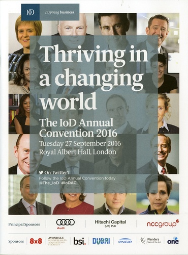 | Set List | 08:00 Breakfast Seminars (Organizational Resilience - Ensuring your business is fit for the future; Creating Competitive Advantage for a Lucrative Business Sale-Post EU Exit), 09:00 Doors Open - reception in Verdi Restaurant Exhibition Area, 10:00 Opening Video, 10:05 Welcome (Simon Walker, Director General, IoD) Brexit - A New Chapter for the UK 10:15 Speech (Rt. Hon. Greg Clark), 10:30 Navigating the Global Economy (Dr Dambisa Moyo), 10:45 Panel Discussion - What Does Brexit Mean For You? (Lord Lamont of Lerwick, Yanis Varoufakis, Vivian Hunt, Simon Walker), 11:10 Speech (Carwyn Jones), 11:15 Speech (Nicola Sturgeon), Leading in Challenging Times 11:30 The Cyber Battlefield (Rob Cotton), 11:45 A Smart Energy Future and What it Means for Business (Wilfrid Petrie), 11:55 Panel Discussion - The Future of Energy (Wilfrid Petrie, Tony Hayward, David Brooks, Alexander Maddan, Leo Johnson), 12:30 Looking Beyond the Numbers (Robert Gordon), 12:45 Exhibitions and Lunch, 14:25 Welcome Back (Lady Barbara Judge CBE, Chairman, IoD) Embracing Disruption and Nurturing Innivation 14:40 Speech (Steve Hatch), 14:55 Speech (Martha Lane Fox CBE), 15:10 Speech (Brad Smith), 15:15 Speech (Olivier Grémillon), 15:30 Speech (Amee Chande and James Ashton), Don't Hold Back 15:50 Gold Standard Leadership (Dame Kelly Holmes), 16:10 Twenty Ideas in Twenty Minutes (Kevin Roberts), 16:30 Closing Remarks (Simon Walker), 16:35 Highlights of the Day |