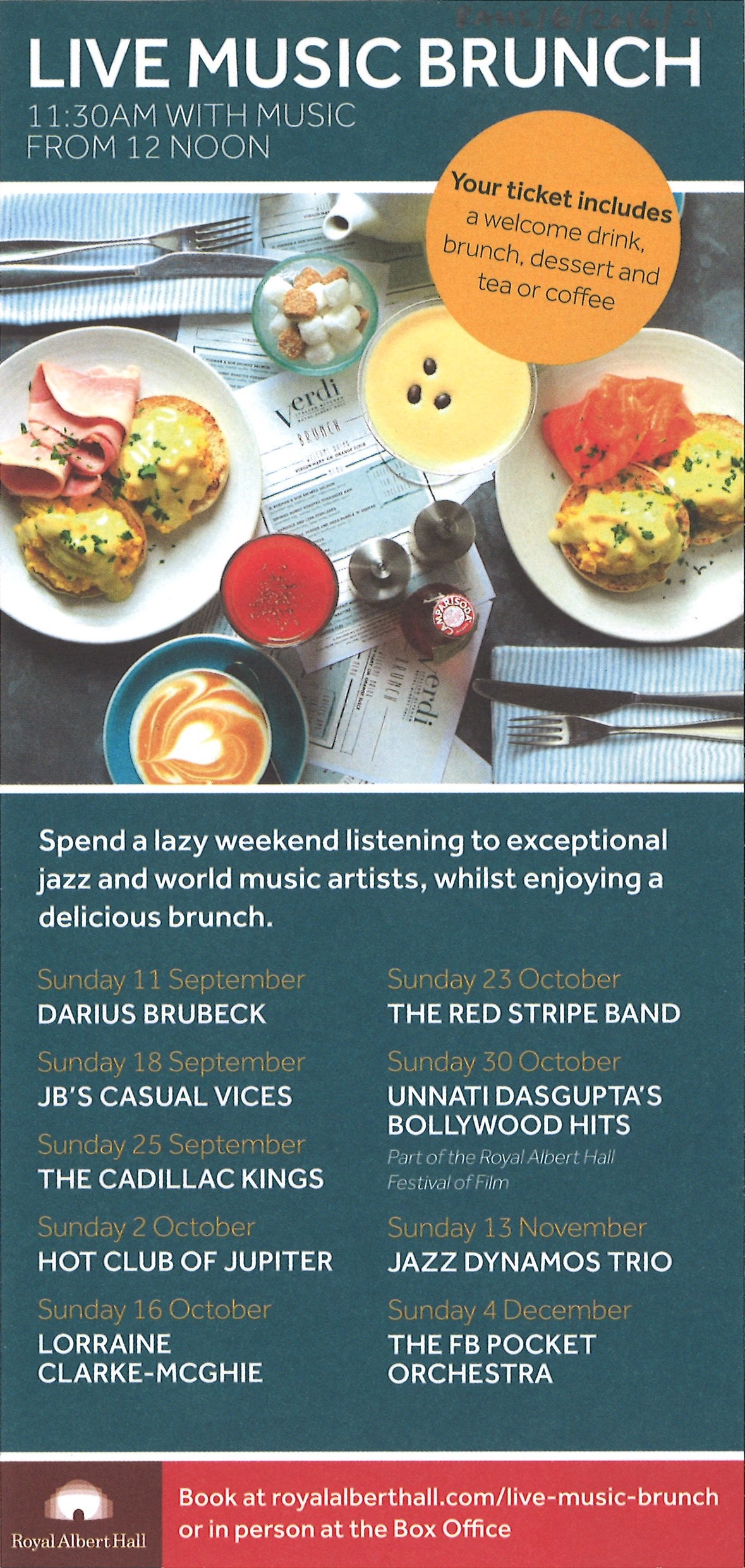 Live Music Brunch takes place in Verdi Italian Kitchen at the Royal Albert Hall, which offers casual dining and great music within one of Londons most iconic settings. Your ticket includes a welcome drink, main course and dessert, served with tea or coffee, all accompanied by great live music.