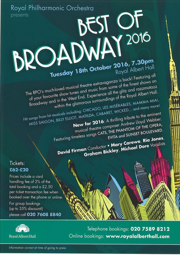 | Set List | 'Overture from Gypsy', Styne, 'Title Song' from 'Cabaret', Kander, 'I'm Reviewing the Situation' from 'Oliver', Bart, 'All That Jazz' and 'Class' from 'Chicago', Kander, ''My House' from 'Matilda', Minchin, 'Agony' from 'Into the Woods', Sondheim, 'Sun and Moon', from 'Miss Saigon', Schonberg, 'I've Had the Time of my Life', from 'Dirty Dancing', Previte, 'Defying Gravity' from 'Wicked', Schwartz, 'The Jellicle Ball', from 'Cats', Lloyd Webber, 'Superstar', from 'Jesus Christ Superstar', Lloyd Webber, 'Music of the Night', from 'Phantom of the Opera', Lloyd Webber, 'As If We Never Said Goodbye', from 'Sunset Boulevard', Lloyd Webber, 'One Day More: Act 1 Finale', from 'Les Misearbles', Schonberg, 'Abba Medley' from 'Mama Mia', Ulvaeus, Andersson |