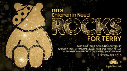 | Set List | 'Overture' (Orchestra), Opening Link (Fearne Cotton, Greg James), 'Fly Me To the Moon' (Olly Murs, House Band, Orchestra), 'Come Fly With Me' (Olly Murs, House Band, Orchestra), 'Leroy Brown' (Olly Murs, House Band, Orchestra), Link to Children in Need Highlights (Olly Murs, Fearne Cotton, Greg James), 'Grow Up' (Olly Murs, House Band, Orchestra), Children in Need Highlights, Link (Greg James, Fearne Cotton), 'Surfin' USA', Beach Boys (The Vamps, Orchestra brass and strings) (inflated beach balls in arena), Link (Fearne Cotton, Greg James), Appeal, Link (Fearne Cotton, Greg James), Terry Wogan Children in Need VT, 'How Long Will I Love You' (Ellie Goulding, House Band, Orchestra), Link (Greg James, Fearne Cotton), 'Still Falling For You' (Ellie Goulding, House Band, Orchestra), Link (Greg James, Fearne Cotton), 'Never Gonna Give You Up' (Rick Astley, House Band, Orchestra), Link (Greg James, Fearne Cotton), Appeal, Link (Greg James, Fearne Cotton), 'I Will Always Love You' (Beverley Knight), Live Item - Quiz INTERVAL Link (Greg James, Fearne Cotton), 'I Am the Very Model of a Modern Major-General', Gilbert, Sullivan (Alexander Armstrong, House Band, Orchestra, Choir), Link (Greg James, Fearne Cotton), Appeal, Link (Greg James, Fearne Cotton), 'Over the Rainbow' (S Escoffery with video of Eva Cassidy, Orchestra woodwind and strings), Link (Greg James, Fearne Cotton), Video - Janet and John, Link (Greg James, Fearne Cotton), '9 to 5', D Parton (Ward Thomas, House Band, Orchestra), Link (Greg James, Fearne Cotton), Appeal, Link (Greg James, Fearne Cotton), 'Stardust' (Gregory Porter, House Band, Orchestra), Link (Greg James, Fearne Cotton), 'These Days' (Take That, House Band, Orchestra), 'Rule the World' (Take That, House Band, Orchestra), 'Never Forget' (Take That, House Band, Orchestra), Link (Fearne Cotton, Greg James), Terry Wigan VT, Closing Link (Fearne Cotton, Greg James), 'The Floral Dance' Michael Ball, Alfie Boe, House Band, Orchestra, Brighouse and Rastrick Brass Band, Choir) |