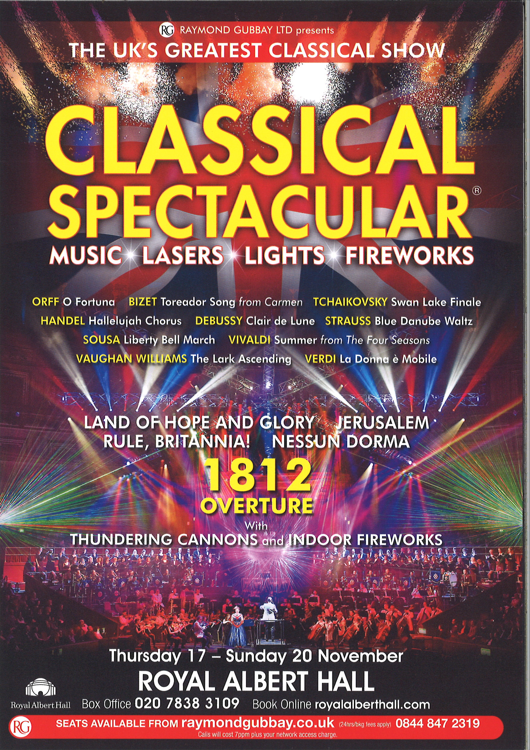 | Set List | 'O Fortuna' from Carmina Burana, Orff, 'Liberty Bell March', Sousa, 'Clair de lune', Debussy, 'Finladia', Sibelius, 'The Blue Danube Waltz', Strauss II, 'Soldier's Chorus' from Faust, Gounod, 'The Lark Ascending', Vaughan Williams, 'Au fond du temple saint' from the Pearl Fishers, Bizet, 'Scene Finale' from Swan Lake, Tchaikovsky, 'Pomp and Circumstance March No 1', Elgar, INTERVAL 'Prelude to Act III', Wagner, 'Toreador Song' from Carmen, Bizet, 'La donna e mobile' from Rigoletto, Verdi, 'Csardas' Monti, 'Summer' [finale] from The Four Seasons, Vivaldi, 'Hallelujah Chorus', from Messiah, Handel, 'Jerusalem', Parry, 'Rule Britannia!', Arne, 'Nesun dorma', from Turandot, Puccini, '1812 Overture', Tchaikovsky, |