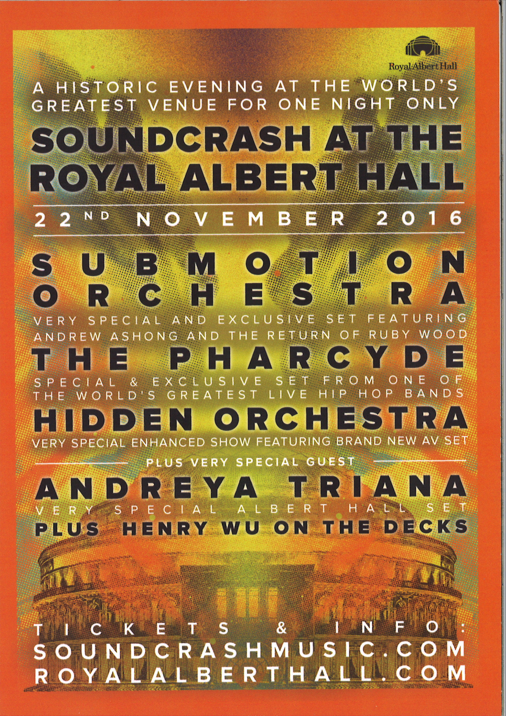 | Performance Notes | After a decade of some of the most game changing shows London has seen, Soundcrash presents its first mini-festival at the Royal Albert Hall, bringing you a historic evening of game-changing sights and sounds to the worlds greatest venue.