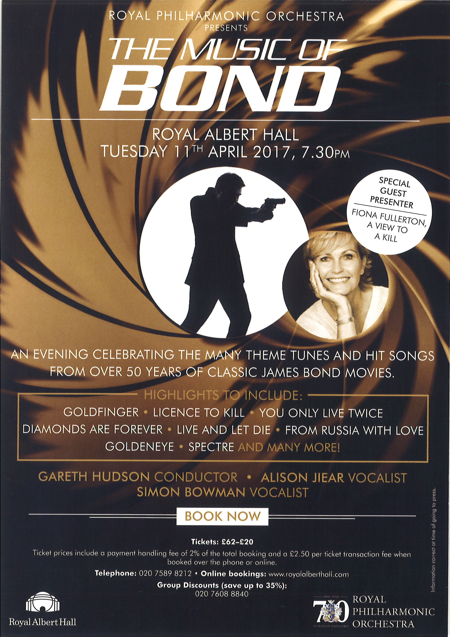 | Set List | 'Dr No', James Bond Theme, Norman (Royal Philharmonic Orchestra), 'Thunderball', Title Song, J Barry (Simon Bowman), 'Goldfinger', Title Song, J Barry (Alison Jiear), 'You Only Live Twice', Title Song, J Barry (Alison Jiear), 'From Russia With Love', Title Song, J Barry (Simon Bowman), 'Moonraker', Title Song, J Barry (Alison Jiear), 'Diamonds are Forever', Title Song, J Barry (Alison Jiear), 'Casino Royale', Main Theme, David, Bacharach (Royal Philharmonic Orchestra), The Spy Who Loved Me - 'Nobody Does it Better', Hamlisch (Alison Jiear), 'The Man with the Golden Gun', Title Song, J Barry (Alison Jiear), On Her Majesty's Secret Service - 'We Have All the Time in the World', J Barry (Simon Bowman), 'A View to a Kill', Suite, J Barry (Simon Bowman), 'Licence to Kill', Title Song, Walden, Cohen (Alison Jiear) INTERVAL 'A View to a Kill', Title Song, J Barry (Simon Bowman), 'For Your Eyes Only', Title Song', Conti (Alison Jiear), Octupussy - 'All Time High', J Barry (Alison Jiear), Bond Sound Demonstration (Royal Philharmonic Orchestra), 'The Living Daylights', Title Song', J Barry (Simon Bowman), 'Goldeneye', Title Song, Bono, The Edge (Alison Jiear), Tomorrow Never Dies - 'Surrender', Arnold, Black (Simon Bowman, Alison Jiear), Die Another Day - 'Welcome to Cuba', Arnold (Royal Philharmonic Orchestra), Casino Royale - 'You Know My Name', Cornell, Arnold (Simon Bowman), 'The World is Not Enough', Title Song, Arnold, Black (Alison Jiear), Spectre - 'The Writing's on the Wall', S Smith (Simon Bowman), 'Live and Let Die', Title Song, P McCartney (Simon Bowman), 'Skyfall', Title Song, A Atkins, Epworth (Alison Jiear), 'Skyfall' (orchestra only), A Atkins, Epworth (Royal Philharmonic Orchestra) ENCORE Quantum of Solace - 'Another Way to Die', White (Simon Bowman, Alison Jiear) |
