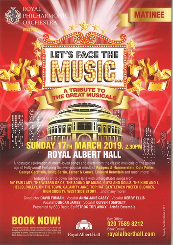 | Set List | 'Overture' from Gypsy, Styne, 'Lets Face The Music and Dance' from Top Hat, Berlin, 'Cabaret' from Cabaret, Kander, 'Oh What A Beautiful Mornin' and 'Oklahoma!'' from Oklahoma!, Rodgers, 'March of the Siamese' from The King and I, Rodgers (with ArtsEd Ensemble), 'On the Street Where You Live' from My Fair Lady, Loewe (with Oliver Tompsett), 'Put On Your Sunday Clothes' from Hello, Dolly!, Herman (with Arts Ed Ensemble) 'Get Happy' from Summer Stock, Arlen, Koehler, 'Sue Me' from Guys & Dolls, Loesser (Kerry Ellis, Alex Gaumond), 'Sit Down Youre Rockin The Boat' from Guys & Dolls, Loesser (Oliver Tompsett, ArtsEd Ensemble), 'I Can Cook Too' from On The Town, Bernstein (Anna-Jane Casey), 'Ya Got Me' from On The Town, Bernstein INTERVAL 'Overture' from Sweet Charity, Coleman, 'Something's Coming' from West Side Story, Bernstein (Oliver Tompsett), 'One' from A Chorus Line, Hamlisch, 'Bless Your Beautiful Hide' from Seven Brides For Seven Brothers, De Paul, Mercer (Alex Gaumond), 'Dancing In The Dark' from The Band Wagon, Schwartz, 'Over the Rainbow' from The Wizard Of Oz, Arlen (Kerry Ellis), 'You're the Top' from Anything Goes, Porter (Anna-Jane Casey, Oliver Tompsett) 'Diamonds Are a Girl's Best Friend' from Gentlemen Prefer Blondes, Styne (Anna-Jane Casey), 'Some Enchanted Evening' from South Pacific, Rodgers (Alex Gaumond, ArtsEd Ensemble) 'Dont Rain On My Parade' from Funny Girl, Styne (Kerry Ellis), 'The Sound of Music Medley' (ArtsEd Ensemble, Anna-Jane Casey, Kerry Ellis, Alex Gaumond, Oliver Tompsett) ENCORE 'Youll Never Walk Alone' from Carousel, Rodgers |