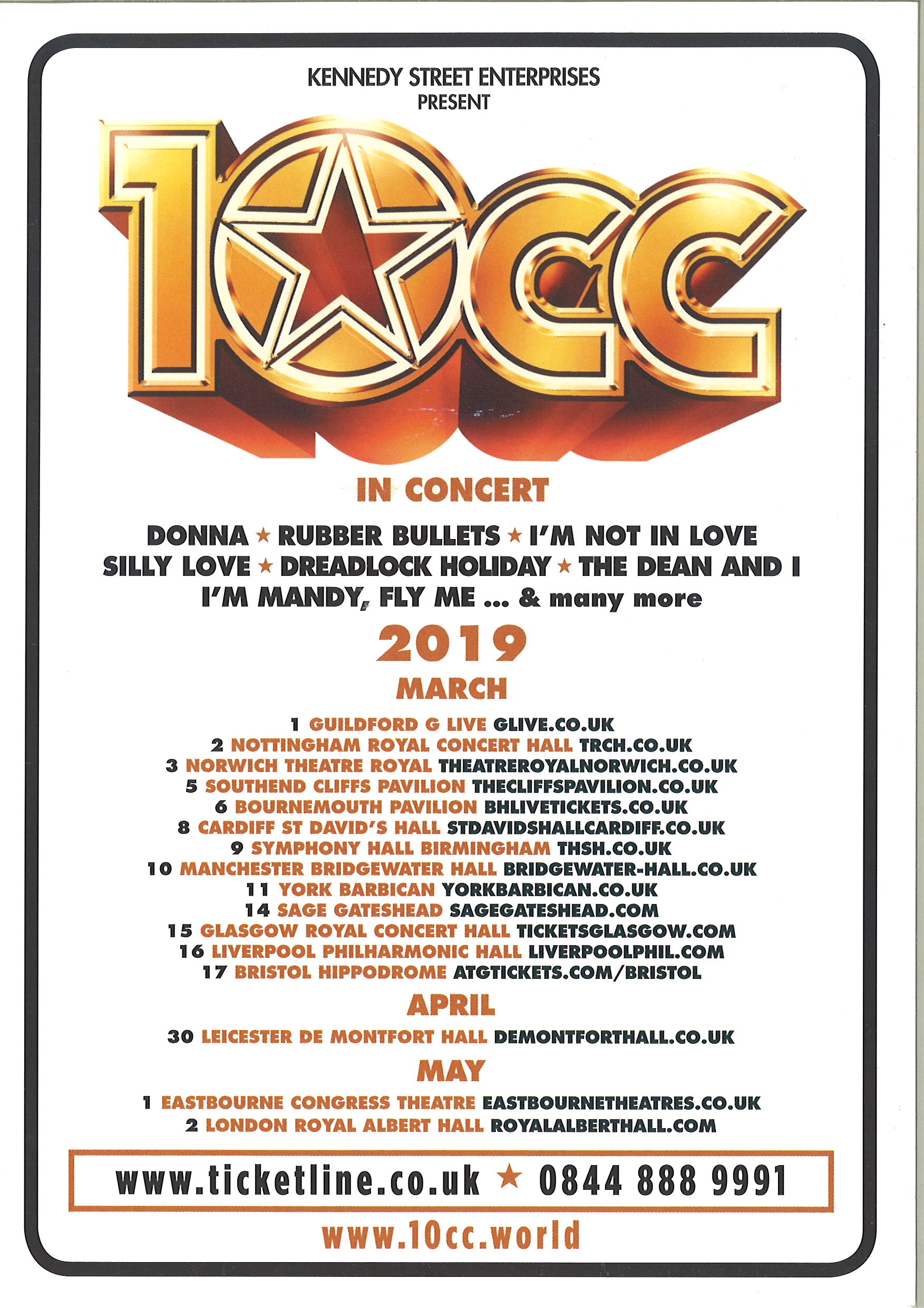 20:35 10cc: Intro - 'Neanderthal Man', Hotlegs, 'The Wall Street Shuffle', 'Art for Art's Sake', 'Life is a Minestrone', 'Good Morning Judge', 'The Dean and I', 'Old Wild Men', 'Clockwork Creep', 'Feel the Benefit', 'The Things We Do for Love', 'Say the Word', Hornal, 'Silly Love', 'Somewhere in Hollywood', 'Baron Samedi', 'I'm Mandy Fly Me', 'I'm Not in Love', 'Dreadlock Holiday' ENCORE 'Ready to Go Home', 'Donna' (acapella), 'Rubber Bullets' |