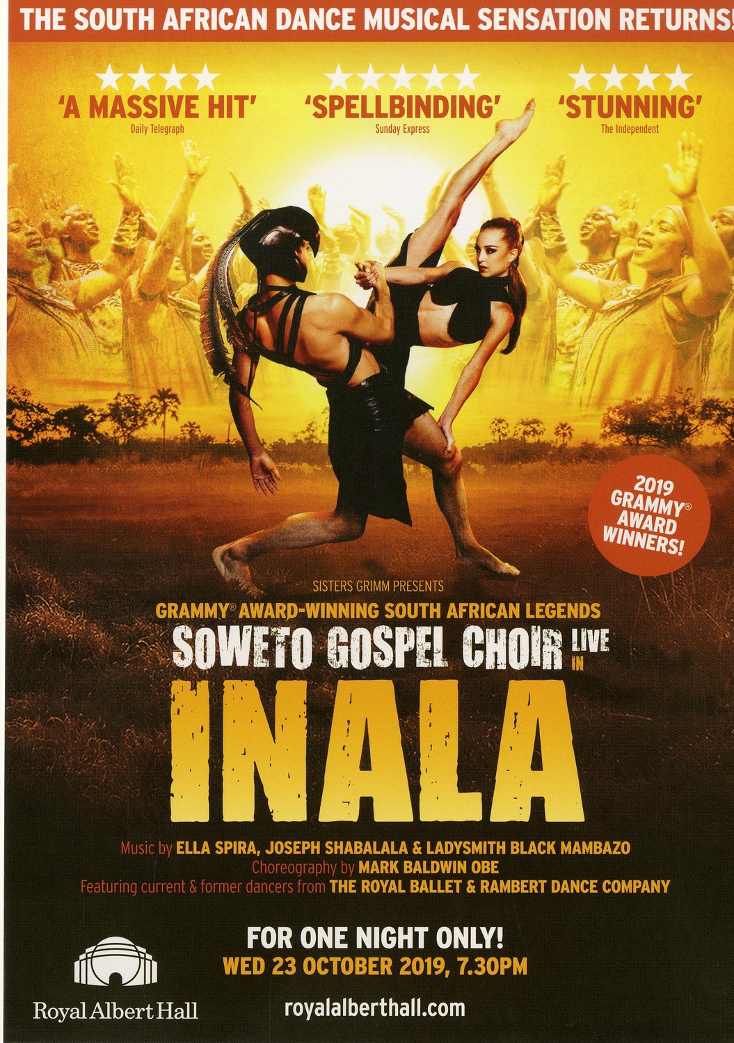 | Performance Notes | Inala meaning abundance of goodwill is a muscular and beautiful blend of South African and Western cultures. Celebrating World Ballet Day and Black History Month, triple Grammy® Award-winning choral legends, the Soweto Gospel Choir joins guest stars from The Royal Ballet to perform an exhilarating fusion of South African and Western cultures live on stage.