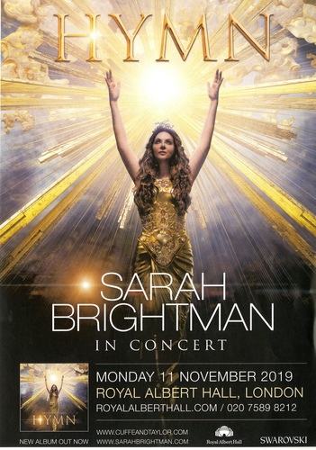 Performance NotesThe world’s most successful and best-selling soprano, Sarah Brightman, returns to London for the first time in fifteen years. Her new world tour, HYMN: Sarah Brightman in Concert will come to the Royal Albert Hall in November 2019, for one night only.