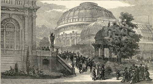 "An imposing army of policemen, volunteers, stewards, and officials, placed at every corner and door, all with a pleasant smile and the very pink of courtesy - it is always the case at South Kensington where the gentleman-amateur system prevails extensively - soon, however, marshalled the folks to their places, and by 8.30, the hour fixed for the arrival of the royal party, the great hall was crammed, though carriages still rolled up and kept adding to the gigantic audience. The upper galleries were quite packed, the boxes were full, the grand circle was a noble sight, and the arena, from which all seats had been removed was so thronged that the favoured possessors of tickets could hardly move hand or foot. Had the seats about the organ and choir the circle of faces would have been complete, and the picture perfect. The noble poportions of this striking hall were never seen to such advantage: the lighting was pronounced to be admirable, and the cold white of the interior was toned down by the gorgeous colour of the dresses, pointing out who was who, and listening to the Royal Artillery Band, which proved to be indefatigable.