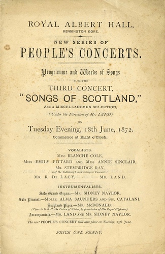 | Main Performers | Miss Blanche Cole, Miss Emily Pittard, Miss Annie Sinclair, Mr Stembridge Ray, Mr R De Lacy, Mr Land - vocals, Sidney Naylor - organ, Alma Saunders, Signor Catalani - pianos, Mr McDonald - Highland pipes |