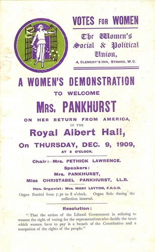 | Main Performers | Mrs Emmeline Pankhurst, Mrs Pethick-Lawrence (Chair), Mary Leigh, Christabel Pankhurst - speakers |