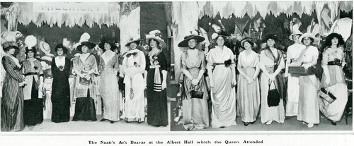 '...There is some uncertainty as to the period which is now represented, for the scheme of decoration there are suggestions of Scheherazade and the mysteries of the Arabian Nights Entertainments, and also of the Great Flood, for Noah's Ark towers above all else. The strange animals with grinning faces and glistening eyes which guard the stalls are, however, of a prehistoric kind which one is not inclined to associate with the sojourn in the Ark. The atmosphere of the Arabian Nights has been especially cleverly suggested, and with varying shades of blue Mrs Hwfa Williams has evolved a delightful effect. The centre of the hall is occupied by two of the most striking exhibits, Messrs. Marshall and Snelgrove's display of the very latest fashions and Messrs. Carter's Japanese garden. The remaining stalls, about forty in number, cater for every taste, from cigarettes to American candy, from knick-knacks to autographed books, and from flowers to tea and coffee. In one way only could the visitor escape a constant fusillade of requests to buy, and that was the purchase of an "Indemnity Badge", which was by no means a bad investment at a sovereign.' (The Times, June 12 1913)