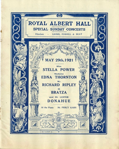 | Main Performers | Miss Stella Power, Madame Edna Thornton, Mr Richard Ripley, Mr Bratza, Mr Lester Donahue |