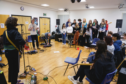 The two workshops culminated in a live performance that brought together the choir and guitar students into one big collective, collaborating with the band on epic-sounding, distortion-laden renditions of Bashed Out and Earthquake, and bringing together all the various techniques learnt that day.
