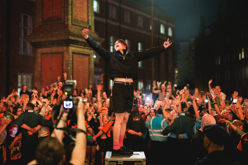 Fans camped overnight on the Hall's South Steps to get to the front of the arena and by late afternoon their were several hundred fans outside in party mood. After the concert Yungblud came outside Dr 11 to meet fans, posing on a flight case. During the concert the crowd were lively with dancing, circle pits and a wall of death. |