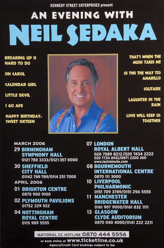 | Set List | 'The Other Side of Me', 'Standing on the Inside', 'The Queen of 1964', 'Oh Carol', 'Happy Birthday, Sweet Sixteen', 'Where the Boys Are', 'Calendar Girl', 'You', 'Laughter in the Rain', 'Should Have Never Let You Go', (Dara Sedaka - via video), 'Is This The Way to Amarillo (Tony Christie), 'Solitaire', 'Betty Grable', 'Breaking Up Is Hard to Do', 'I Go Ape', 'The Hungry Years', 'Fantasy Impromptu', 'Superbird', 'The Immigrant', 'Love Will Keep Us Together ', 'That's When the Music Takes Me' |