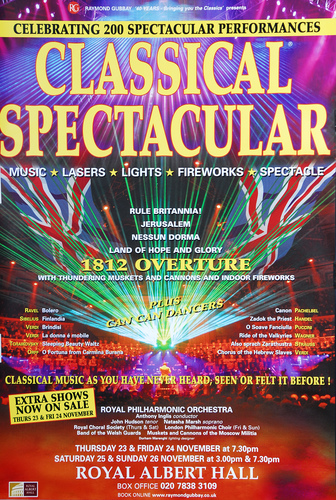 | Set List | 'Ride of the Valkyries' from Die Walkure, Wagner (Royal Philharmonic Orchestra), 'Chorus of the Hebrew Slaves' from Nabucco, Verdi (Choir, Royal Philharmonic Orchestra), 'Entry of the Gladiators', Fucik (Royal Philharmonic Orchestra), 'Canon', Pachelbel (Royal Philharmonic Orchestra), 'Farandole' from L'Arlesienne Suite No.2, Bizet (Royal Philharmonic Orchestra), 'O Soave Fanciulla' from La Boheme, Puccini (Natasha Marsh, John Hudson, Royal Philharmonic Orchestra), 'Brindisi' from La Traviata, Verdi (Natasha Marsh, John Hudson, Choir, Royal Philharmonic Orchestra), 'Bolero', Ravel (Royal Philharmonic Orchestra), 'Pomp and Circumstance March No.1', Elgar (Choir, Royal Philharmonic Orchestra) INTERVAL 'O Fortuna' from Carmina Burana, Orff (Choir, Royal Philharmonic Orchestra), 'Finlandia', Sibelius (Royal Philharmonic Orchestra), 'La Donna e Mobile' from Rigoletto, Verdi (John Hudson, Royal Philharmonic Orchestra), 'Zadok the Priest', Handel (Choir, Royal Philharmonic Orchestra), 'Czardas', Monti (David Garrett, Royal Philharmonic Orchestra), 'Sempre Libera' from La Traviata, Verdi (Natasha Marsh, Royal Philharmonic Orchestra), 'Waltz' from The Sleeping Beauty, Tchaikovsky (Royal Philharmonic Orchestra), 'Jerusalem', Parry (Choir Royal Philharmonic Orchestra), 'Rule, Britannia!', Arne (Choir, Royal Philharmonic Orchestra), 'Nessun Dorma' from Turandot, Puccini (John Hudson, Choir, Royal Philharmonic Orchestra), '1812 Overture', Tchaikovsky (Band of the Welsh Guards, Muskets and Cannons of the Moscow Militia, Royal Philharmonic Orchestra) |