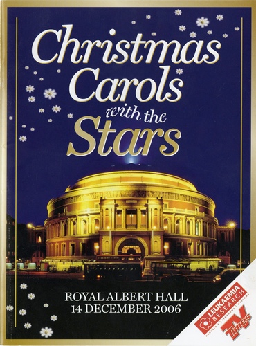 | Set List | 'Hark ! The Herald Angels Sing', Mendelssohn, arr. Willcocks (Everyone), 'Candlelight Carol', J Rutter (Caterham High School Choir), 'Comfort and Joy', trad. arr. M Thomas (Band), 'May Angels Guard Your Dreams', A Parmley (Sydenham High School Choirs), 'It Came Upon a Midnight Clear', trad. arr. Willcocks (Everyone), Special Feature (Liam O'Brien), 'See Amid the Winter's Snow', J Goss, arr. Willcocks (Everyone), Special Feature (Kerry Norton) 'The First Nowell', trad. arr. Willcocks (Everyone) INTERVAL 'Once in Royal David's City', H J Gauntlett, arr. Willcocks (Everyone), Special Feature (Heather Peace), The Appeal, 'A Christmas Medley', arr. A Parmley (Massed Choirs & Band), 'Intrada: Ein' Feste Burg', arr. R Farr (Band, Organ, Trumpets), Special Feature (David Lonsdale), 'God Rest You Merry Gentlemen', trad. arr. Willcocks (Everyone), Special Feature - The Bill (Graham Cole), 'O Come, All Ye Faithful', J F Wade, arr. Willcocks (Everyone) |