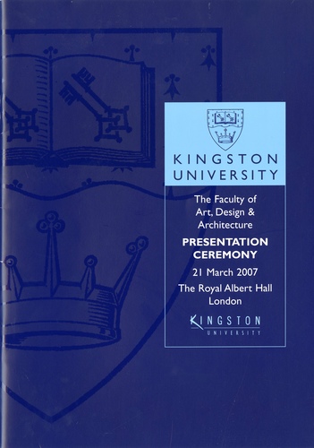 | Set List | 'Suite from Schindler's List', John Williams (Ian Chang), 'Choruses from Requiem', Faure (Kingston University Big Band) Academic Procession, 'La Rejouissance - Music for the Royal Fireworks', Handel, 'Fanfare: Kingston', M Arnold (Fanfare Trumpeters of the Royal School of Military Music), Opening of the Ceremony, Welcome and Introduction (Professor Sir Peter Scott, Vice-Chancellor), Conferment (Vice-Chancellor of Honorary Doctorates): Fiona Banner - Introduced by Louis Nixon, Head of School of Fine Art, Jasper Morrison - Introduced by Simon Maidment, Course Director, Product & Furniture Design, James Irvine - Introduced by Ian Higgins, Course Director, Interior Design, Musical Interlude, 'Triumphal March and Ballet Music (Aida)', Verdi (Kingston University Symphony Orchestra and Chorus), Presentation of Awards to PhDs, Masters and Graduates (The Dean of the Faculty of Art, Design AND Architecture Dr Simon Ofield), Presentation (Heads of School), Vote of Thanks (The Dean of the Faculty of Art, Design AND Architecture), Close of Ceremony, Closing Fanfare, 'Fanfare for a Dignified Occasion', A Bliss (Royal Military School of Music, Kneller Hall), Recessional Music (Kingston University Symphony Orchestra), 'Firebird Suite - Final Hymn', Stravinsky (Kingston University Symphony Orchestra) |