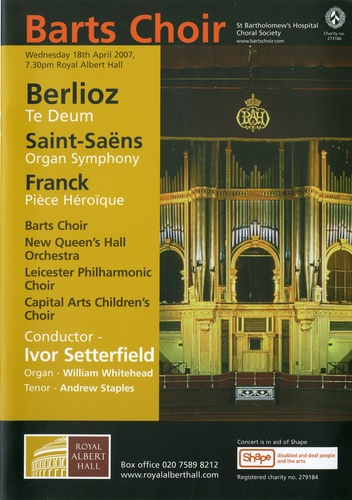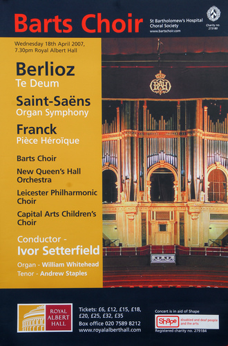 | Set List | 'Piece Heroique (Three Pieces for Grand Organ)', Franck (William Whitehead), 'Symphony No.3 in C Minor, Op.78 'Organ Symphony'', Saint-Saens (William Whitehead, New Queen's Halls Orchestra) INTERVAL 'Te Deum, Op.22', Berlioz (New Queen's Halls Orchestra, Leicester Philharmonic Choir, Capital Arts Children's Choir, St Bartholomew's Hospital Choral Society) |