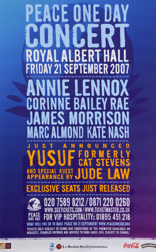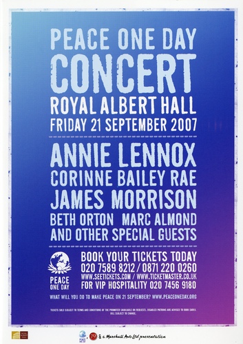 | Performance Notes | Peace One Day call for and work towards a day of ceasefire and non-violence globally. The concert was to raise awareness, which in turn creates action and action save lives. As well as being a musical celebration of peace, the events was an opportunity to thank all their supporters, highlight the extraordinary global Peace Day activities and promote the coming year. Peace One Day began as a film project founded by British filmmaker Jeremy Gilley in 1999 to establish the first ever annual day of global ceasefire and non-violence. In 2001 the Day was unanimously adopted by UN member states as 21 September annually - Peace Day. In 2007 over 100 million people were active on Peace Day, in 192 countries. There were life-saving initiatives in 14 countries, and over 80 activities in Afghanistan alone where 1.4 million children were vaccinated against polio.