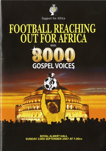 | Set List | 'Asperges Me' (St. Benedict's Choir) 'Viva Africa', Patti Boulaye (Patti Boulaye, Gospel Choir, Sun Dance), 'Celebrate Good News', Patti Boulaye (Patti Boulaye, London Lads, Gospel Choir, Dan Magness), 'Great Balls of Fire', Jerry Lee Lewis (Greg Dyke, The Mighty Handful) 'Let It Be', The Beatles (Rik Waller, Gospel Choir), 'The Football Dance' (Stagecoach), 'Zulu Song' (Isleworth and Syon Choir), 'Wonderwoman', Aret, Gordon, Ambrosius (Aret), 'Higher and Higher' (Aret, Gospel Choir, Peter Sarstedt and Barry Mason, The New Seekers) INTERVAL 'This Little Light' (Choir) 'Tarana' (Fluid Arts), Auction (Christopher Biggins), 'The Lord's Prayer', David Fanshawe (Patti Boulaye, St. Benedict's Choir), 'How Great Thou Art', Carl Boberg (Patti Boulaye, Segun Ajuwon, Gospel Choir, Didier Drogba, Dhol Foundation Drummers), 'Diamonds are a Girl's Best Friend', Jule Styne, Leo Robin (Footballer's Wives, The Lovells' (Lovellies) Ladies Football Team, Village Voices) 'Red Red Rose', 'You'll Never Walk Alone', Barry Mason, Ian Mac (Jon Christos, Gospel Choir, Boney M), Finale - 'O Happy Day' (Everyone) |