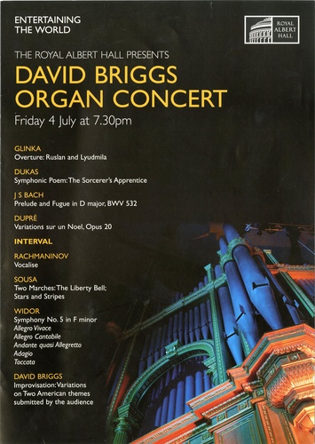 | Set List | 'Overture' from Ruslan and Lyudmila, Glinka. 'Symphonic Poem: The Sorcerer's Apprentice', Dukas. 'Prelude and Fugue in D Major, BWV 532', Bach. 'Variations Sur un Noel, Op.20', Dupre. INTERVAL 'Vocalise', Rachmaninoff. 'Two Marches', Sousa. 'Symphony No.5 in F Minor', Widor. 'Improvisation: Variations on Two American Themes' submitted by the audience |