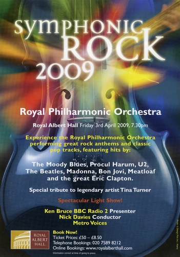 | Set List | 'Fanfare for the Common Man', Copland, 'Bittersweet Symphony' The Verve, Jagger, Richards, 'Bat Out of Hell', Meat Loaf, Steinman, 'A Whiter Shade of Pale', Procul Harum, 'Thriller', Michael Jackson, Temperton, 'Fix You', Coldplay, 'River Deep, Mountain High', T Turner, Spector, Barry, Greenwich, 'Addicted to Love', R Palmer, T Turner, Palmer, 'Simply the Best', T Turner), C Knight, 'Careless Whisper', G Michael, Ridgeley, 'Layla Clapton, Gordon INTERVAL 'Bohemian Rhapsody', Queen, 'Angels', G Chambers, R Williams, 'Walk Like An Egyptian', The Bangles, Sternberg, 'Beautiful Day', U2, 'Livin' On A Prayer', Bon Jovi, ''Nights in White Satin', The Moody Blues, Hayward, 'Classical Gas', M Williams, 'Good Vibrations', The Beach Boys, 'Every Breath You Take', The Police, 'Stairway to Heaven', Led Zeppelin |