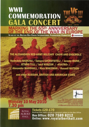 | Set List | Reading of September 1 1939, W H Auden (Jeremy Irons), 'Den Pobedy (VE-Day)', D Tukhmanov (Alexandrov Red Army Choir), 'Polushko-Pole (The Field)', L Knipper (Alexandrov Red Army Choir), 'Svyashennaya Voina (Holy War)', A Alexandrov (Alexandrov Red Army Choir), 'Requiem (Sand Installation)' (Kseniya Simonova), 'V put (Hit the Road)', V Soloviev-Sedoy (Alexandrov Red Army Choir), 'Pesnya o Druzhbe (A Song of Friendship)', V Sidorov (Iosif Kobzon, Alexandrov Red Army Choir), 'Pora v Put-Dorogu (Time to Hit the Road)', V Soloviev-Sedoy (Iosif Kobzon, Alexandrov Red Army Choir), 'Dorozhka Frontovaya (The Road to the Front)', B Mokrousov (Iosif Kobzon, Alexandrov Red Army Choir), 'Smuglyanka (A Girl with a Suntan)', A Novikov (Iosif Kobzon, Kvatro), 'Pesnya o dalekoy Rodine (A Song of the Distant Motherland)', M Tariverdiev (Kvatro), 'Na privale (On a Halt)', A Na-Yun-Kin (Alexandrov Red Army Choir, Dance Ensemble), 'Kalinka', Russian trad. (Alexandrov Red Army Choir), 'Posvyaschenie zhenschine (Dedication to a Woman)', T Gverdtsiteli (Tamara Gverdtsiteli), 'Eternal Love', Aznavour, Garvarents (Tamara Gverdtsiteli), 'Kazachiya Kavaleriyskaya (Cossack Song)', A Alexandrov (Alexandrov Red Army Choir, Dance Ensemble), 'It's a Long Way to Tipperary', J Judge, H Williams (Alexandrov Red Army Choir) INTERVAL 'Letyat Utki (Ducks on the Wing)', Russian trad. (Nadezhda Babkina, The Russian Song Ensemble), 'Oi, Poi, Devka! (Sing, Girl, Sing!)', Russian trad. (Nadezhda Babkina, The Russian Song Ensemble), 'Chernyj voron (Black Raven)', Russian trad. (Nadezhda Babkina, Alexander Marshall), 'Matushka (Mother Dear)', S Trofimov (Alexander Marshall), 'Zhdi Menya (Wait for Me)', K Simonov (Jeremy Irons), 'Na Bezymyannoi Vysote (On a Nameless Hill) (Sand Installation)' (Kseniya Simonova), 'Jerusalem', Parry (Russell Watson), 'Land of Hope and Glory', Elgar (Russell Watson), 'Caruso', L Dalla (Russell Watson), 'Nessun Dorma' from Turandot, Puccini (Russell Watson) 'The Nursery Rhyme Concerto' (Rick Wakeman), 'Eleanor Rigby (in the style of Sergei Prokofiev)' (Rick Wakeman), Address (Christina Schmid), 'Bouree', Bach, arr. I Anderson (Jethro Tull), 'Locomotive Breath', I Anderson (Jethro Tull), 'Katyusha', M Blanter (All Artists) |