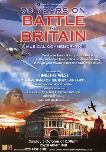 | Set List | 'God Save the Queen' (The National Anthem), arr. Gordon Jacob, 'Crown Imperial', Walton, 'In the Mood', Miller, 'Royal Air Force March Past', Walford Davies, Dyson, 'St. Crispin's Day Speech (Henry V)', Shakespeare, 'Henry V Suite (Movements III and V)', Walton, 'A Nightingale Sang in Berkeley Square', Sherwin, 'The White Cliffs of Dover', Kent, 'Calling All Workers', Coates, 'George Formby Medley', 'Spitfire Prelude and Fugue', Walton INTERVAL 'Fighter Command 1940', Alwyn, 'Lili Marlene', Schultze, 'I'll Be Seeing You', Fain, 'Colonel Bogey March', Alford, 'Where Eagles Dare', Goodwin, 'Flanagan and Allen (Medley)', 'South Rampart Street Parade', Baudac, Haggart 'High Flight', Magee Accompanied by RAF Elegy, 'St Clement Evening Hymn (The Day Thou Gavest, Lord, is Ended)' Rev. C Cotterill Scholefield, arr. Hingley, 'Sunset (Bugle Call)', The Few (from the Churchill speeches), 'Nimrod (Enigma Variations)', Elgar, We Shall Fight On the Beaches (from the Churchill speeches), 'Rule, Britannia!', Arne, 'We'll Meet Again', Parker, 'Pomp and Circumstance March No.1', Elgar |