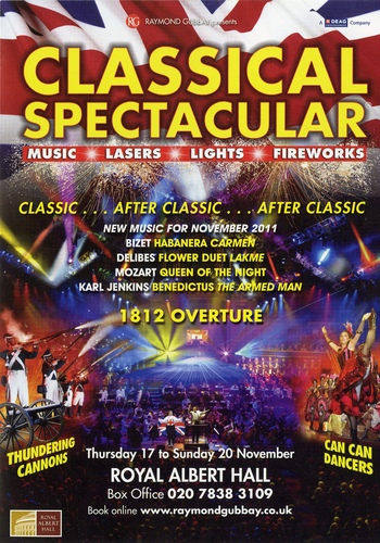 Performance NotesThe ever so popular Classical Spectacular returns to the Royal Albert Hall this November. This will include the usual mix of your favourite music, lights, lasers and special effects. A combined cast of over 200 musicians perform a superb programme of some of the world's best loved classical music including brand new pieces as well as all time favourites.