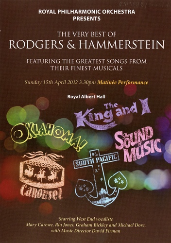 | Set List | 'Overture' from Oklahoma!, 'Oh, What A Beautiful Mornin' from Oklahoma!, 'The Surrey With The Fringe On Top' from Oklahoma!, 'All Er Nothin'' from Oklahoma!, 'People Will Say We're in Love' from Oklahoma!, 'If I Love You' from Carousel, 'When Children Are Asleep' from Carousel, 'Soliloquy' from Carousel, 'Overture' from South Pacific, 'Twin Soliloquies - Some Enchanted Evening' from South Pacific, 'You'll Never Walk Alone' from Carousel INTERVAL 'The Carousel Waltz' from Carousel, I'm Gona Wash That Man Right Outa My Hair' from South Pacific, 'Younger Than Springtime' from South Pacific, 'I in Love With A Wonderful Guy' from South Pacific, 'Something Wonderful' from The King and I, 'Getting To Know You' from The King and I, 'I Have Dreamed' from The King and I, 'Shall We Dance?' from The King and I, 'The Sound of Music' from The Sound of Music, 'My Favourite Things' from The Sound of Music |