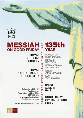 The Royal Choral Societys performance of Handels Messiah at the Royal Albert Hall forms an important part of Great Britains choral tradition. For 133 years, the RCS has given the Good Friday performance of the worlds favourite sacred work in Londons greatest concert venue. They continue this great tradition here at the Royal Albert Hall next Good Friday, 29 March 2013.