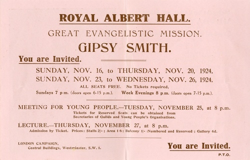 | Performance Notes | 10,000 people are said to have attended nightly for Gipsy Smith's eight day-long stint at the Hall. Resrved tickets for the event could be obtained from Secretaries of Guilds and Young People's Organisations.